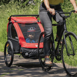 The Burley Honey Bee™ exceeds ASTM safety standards and is equipped with several safety features to protect your kids. It has a 5-point harness system to securely strap children into their seats, a full internal roll cage for impact protection, and reflective details for better visibility during low-light conditions. The parking brake ensures the trailer stays in place when parked, and tinted side windows provide sun protection (UPF 50+). These features make the Honey Bee a trusted choice for families prioritizing safety.