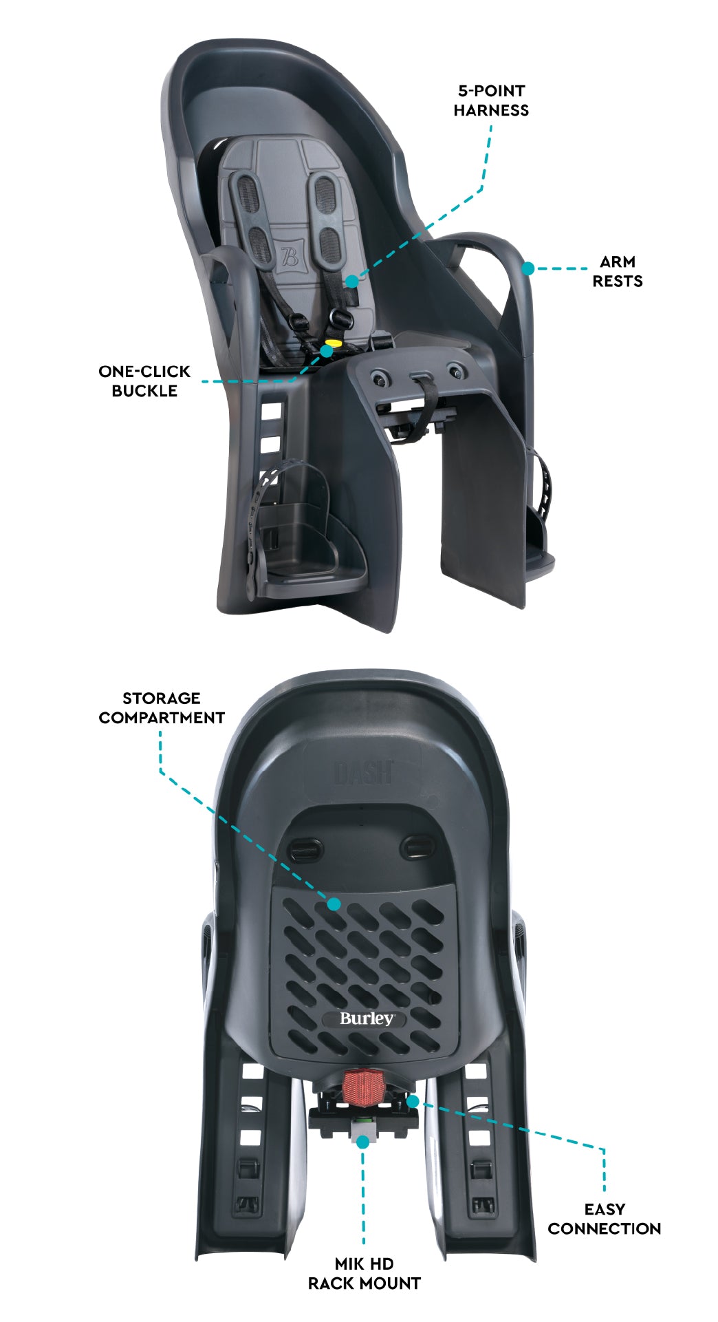 The Dash® RM MIK HD supports children up to 40 pounds, making it suitable for kids up to about 5 years old, depending on their size and weight. The seat’s sturdy frame mount ensures a secure ride as your child grows, maintaining Burley’s commitment to long-lasting, high-quality gear.