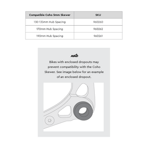 Hinweis: Die Coho 5mm-Schnellspannachse ist für jedes Fahrrad mit einem QR-Schnellspanner erforderlich, um den Coho XC befestigen zu können. Diese Schnellspannachse ersetzt den aktuellen Schnellspanner Ihres Fahrrads, wenn Sie den Coho XC verwenden.