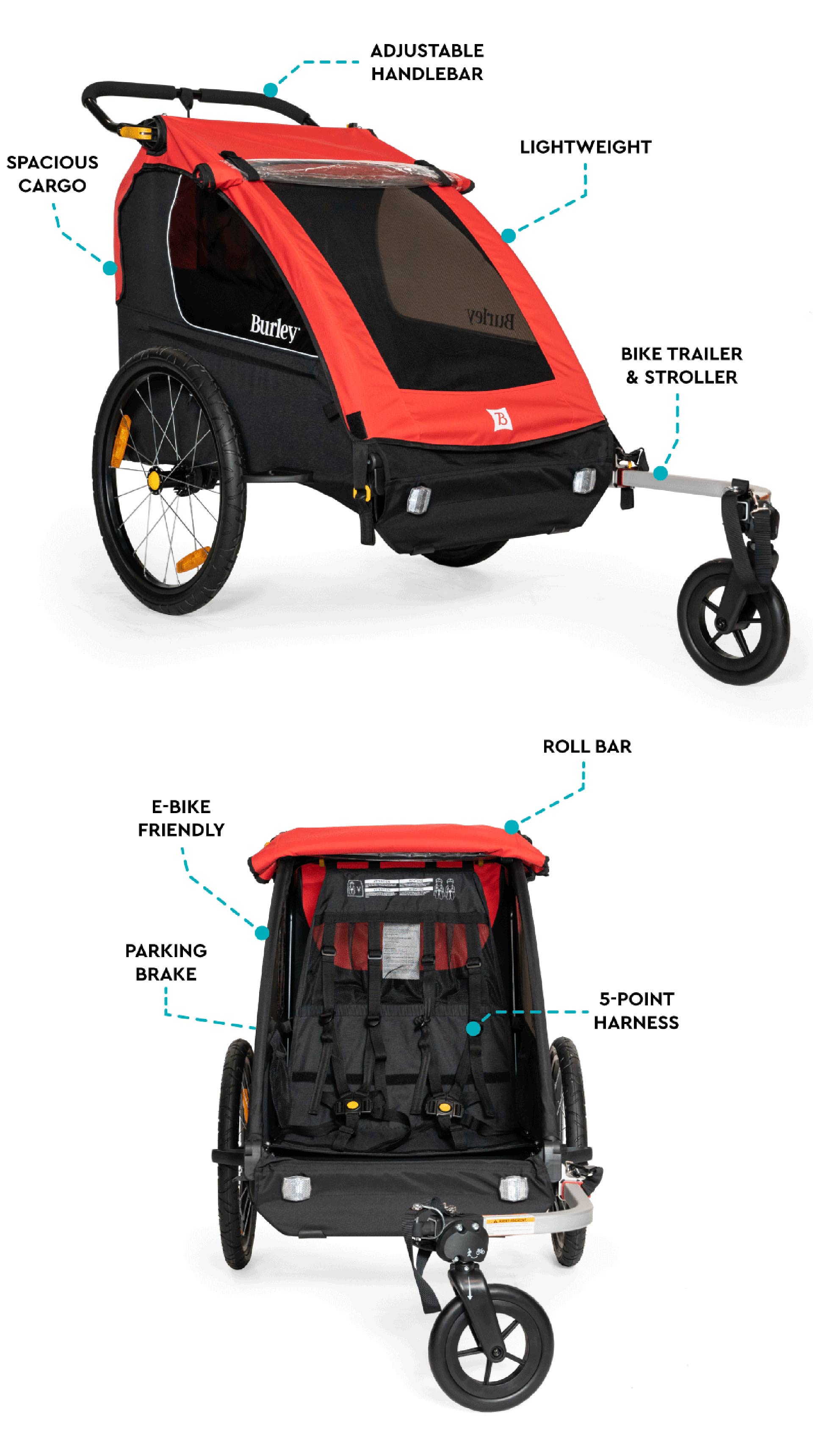 The Burley Honey Bee™ exceeds ASTM safety standards and is equipped with several safety features to protect your kids. It has a 5-point harness system to securely strap children into their seats, a full internal roll cage for impact protection, and reflective details for better visibility during low-light conditions. The parking brake ensures the trailer stays in place when parked, and tinted side windows provide sun protection (UPF 50+). These features make the Honey Bee a trusted choice for families prioritizing safety.