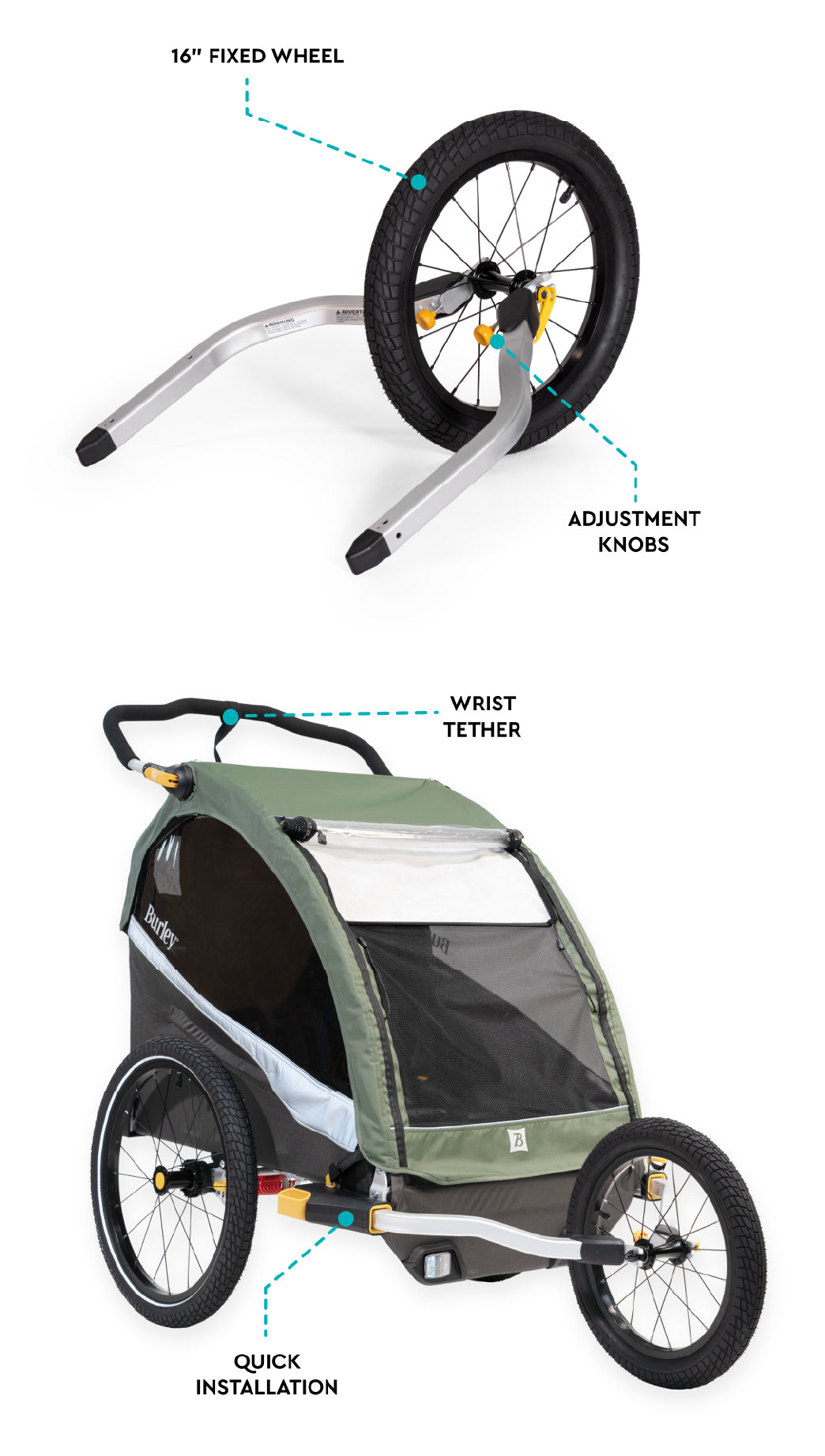 Haz del fitness una actividad familiar con el kit de conversión Jogger Kit. Este kit de fácil instalación transforma tu remolque infantil para bicicletas en una silla de paseo para hacer footing. La rueda delantera fija de 16" se ha diseñado especialmente para la estabilidad necesaria cuando te desplazas a velocidad de jogging. Disponible en modelos de unoo dosasientos, el Jogger Kit elimina la necesidad de una silla de paseo independiente, adaptando tu remolque a tu estilo de vida activo.