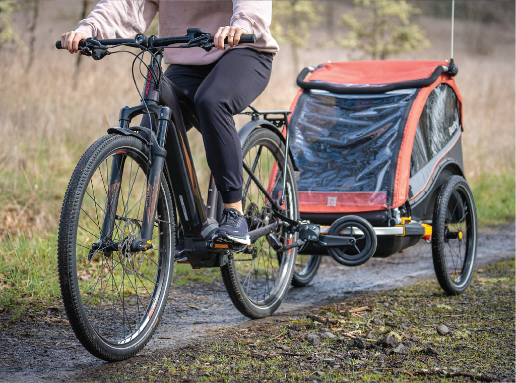 El conector flexible permite tumbar la bicicleta mientras que el remolque permanece de pie