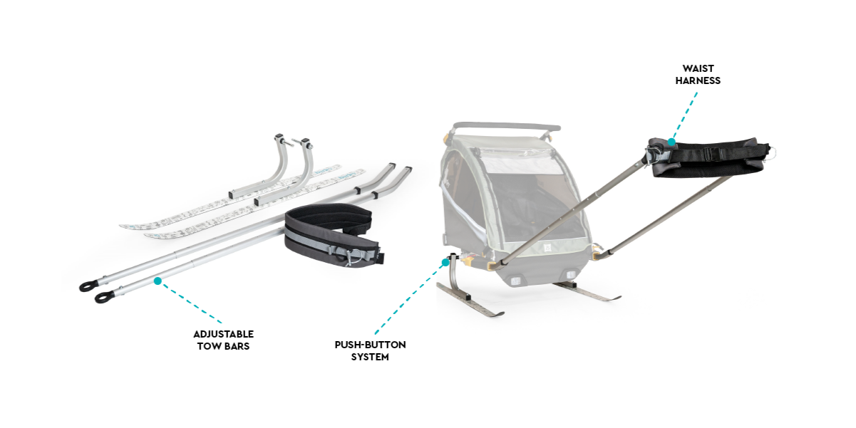 Dota tu remolque de bicicleta para la exploración durante todo el año con este kit de conversión para la nieve. Sobre el río o a través de los bosques, el Ski Kit te permite arrastrar fácilmente tu remolque mientras practicas el esquí de fondo o las raquetas de nieve. Un sencillo sistema de botón a presión permite una instalación fácil y rápida. El arnés de cintura acolchado y las barras de remolque ajustables ofrecen una solución de remolque cómoda para ti, mientras que los esquís del remolque permiten que los pasajeros se deslicen por la nieve con facilidad.