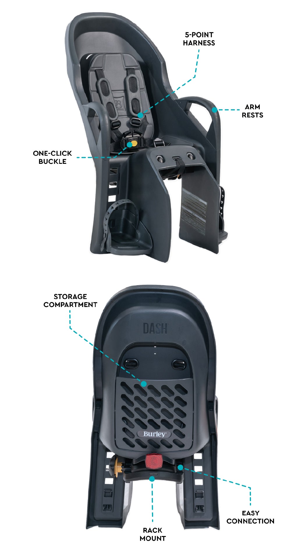 • The Burley Rear Rack is designed to work seamlessly with the Dash RM and meets all safety standards for child bike seats.