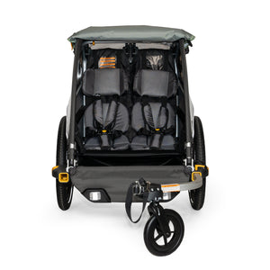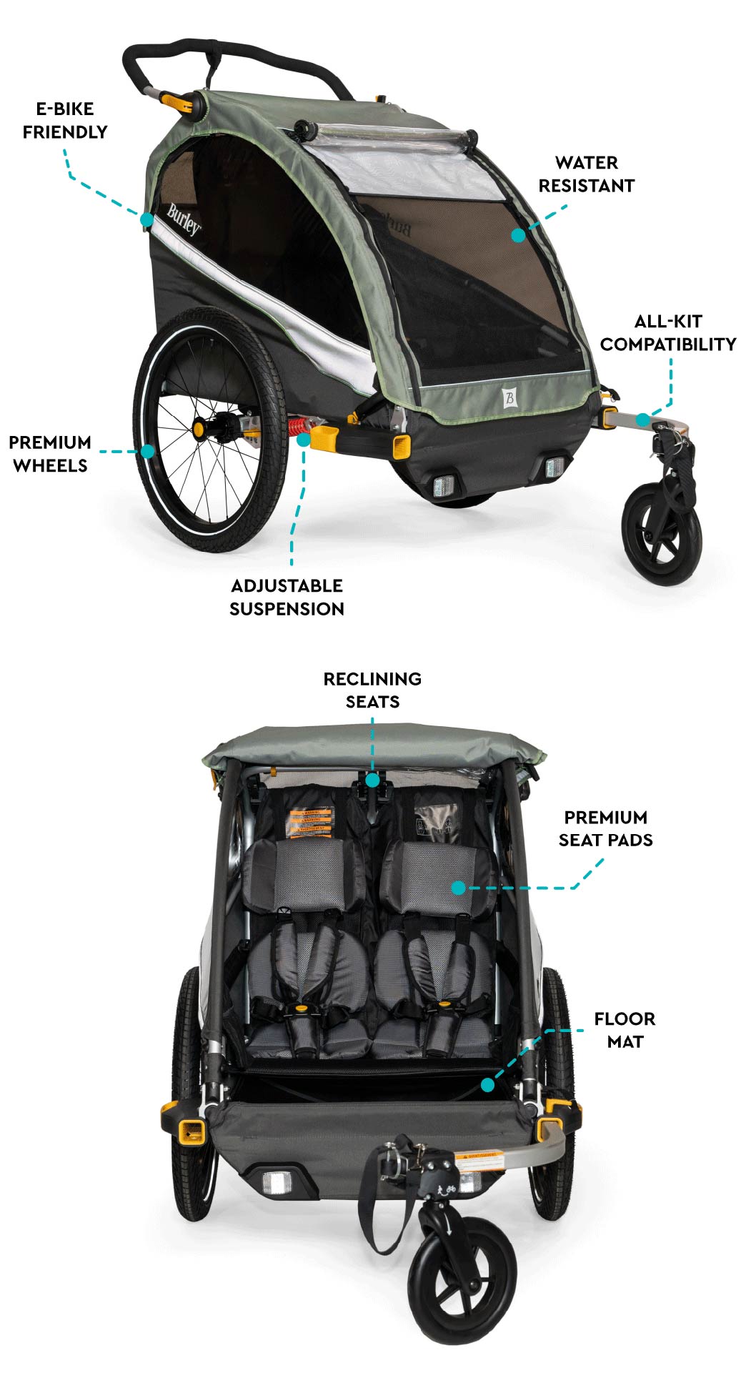 This heavy-duty kids bike trailer and double stroller is built with a rugged base, independently reclining seats, and premium interior.